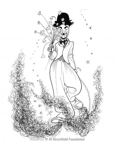 CHARLIE CHAPLIN WALKING IN CLOUDS HOLDING FLOWERS, 1975