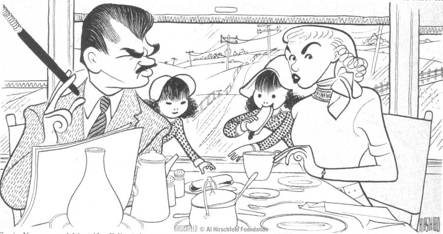 ernie kovacs and edie adams and their children eat on the train. colliers 9/14/56