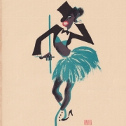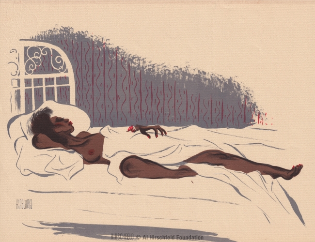 I feel the warm affection Hirschfeld must have felt for Harlem, African American women, and women in general. I feel the warmth and sensuality of this particular woman, the great feeling of her beauty. The spirituality of her soul reads through her whole body. Her hands, her long fingers are so expressive as though to say “my lover has just left and I can’t wait for his return.”