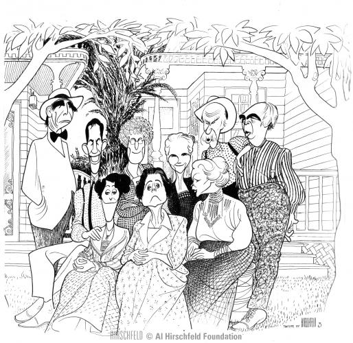 Morning’s at Seven with Lois deBanzie, elizabeth Wilson, maureen O'Sullivan, Merrill, david Rounds, Nancy Marchand, Teresa Wright, richard Hamilton, maurice Copeland. tintype by Hirschfeld. 4/80