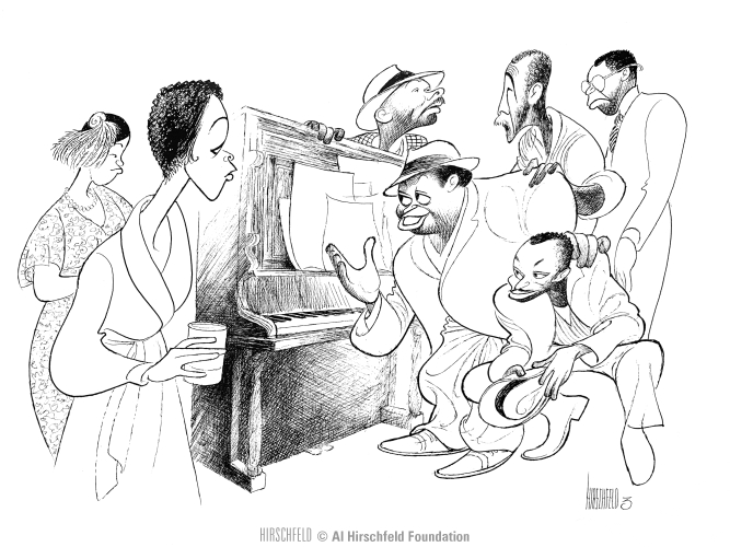 August Wilson’s play is the fourth play in Wilson's The Pittsburgh Cycle. Those ten plays, each set in a different decade, aim to illustrate the Black experience in the 20th century America. Hirschfeld, who had drawn all three Wilson play on Broadway at this point, saw Wilson as “part of a new Broadway during this era, depicting Americans and parts of American history that didn’t quite make it to the boards during the Cole Porter highball years.” The Pulitzer Prize winning drama tells the story of a brother and sister in 1936 Pittsburgh who are at odds over selling the family heirloom, a piano with carvings of the family’s suffering.
