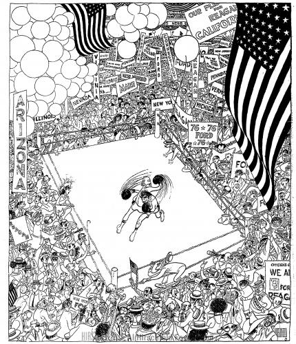 REPUBLICANS '76- FORD AND REAGAN IN THE BOXING RING. (8/16/76)