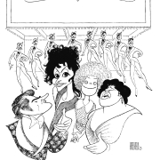 Stewart Lane surround by posters: Goodbye Girl, Will Rogers Follies, La Cage Aux Folles, Woman of the Year, 1/94