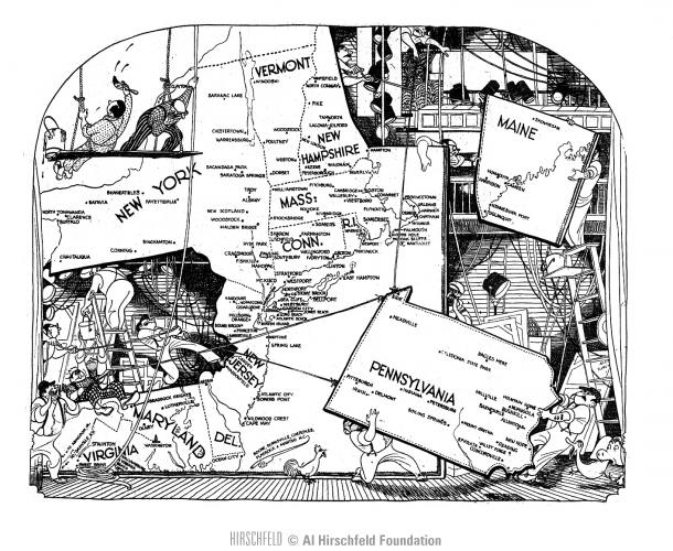 Summer Theatre Map, 6/16/56 with summer theatre map being assembled as stage scenery