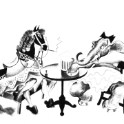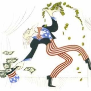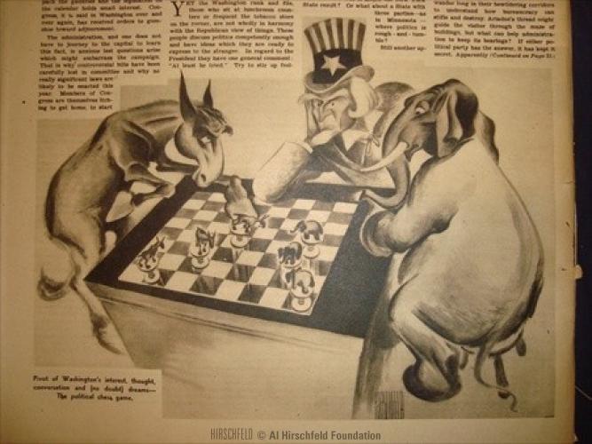 Elephant and Donkey play chess while Uncle Sam looks on, 1936