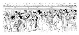broadway first nighters. mural for playbill room of hotel manhattan, c. 1958