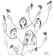rick steiner with characters from six of his plays, ink and goauche 9/02