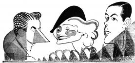 shakespeare, shaw, and o’neill manipulate their characters, mural for playbill room at the hotel manhattan, 1958julie andrews and rex harrison in my fair lady, alfred lunt and lynn fontanne in the taming of the shrew, florence eldridge and frederic march in long day’s journey into night