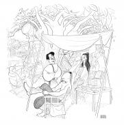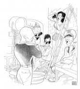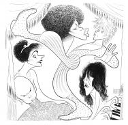 richard rodgers surrounded by characters from his greatest shows, gouache. stereo review cover feb. 1978