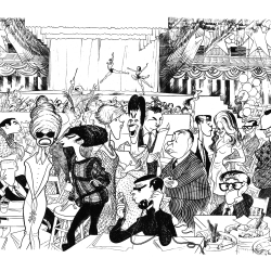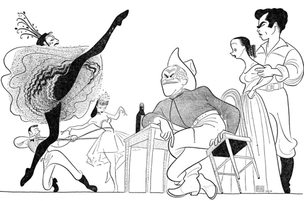 In the early 1950s, Cheryl had a huge success with Brigadoon. Her other musical productions during that period were Flahooley and Paint Your Wagon, both drawn by Hirschfeld. The period also inaugurated what was to be a fruitful, if not always financially successful, ten-year collaboration with Tennessee Williams. Cheryl produced four of his plays: The Rose Tattoo, Camino Real, Sweet Bird of Youth, and Period of Adjustment.  Of the complicated and challenging production that was Camino Real, Cheryl wrote to Tennessee on April 30, 1953, “What can I say to you now except that I’m proud to have done it. I’d do it again knowing the outcome.” Tattoo, Camino, and Sweet Bird were captured by the pen of Al Hirschfeld.