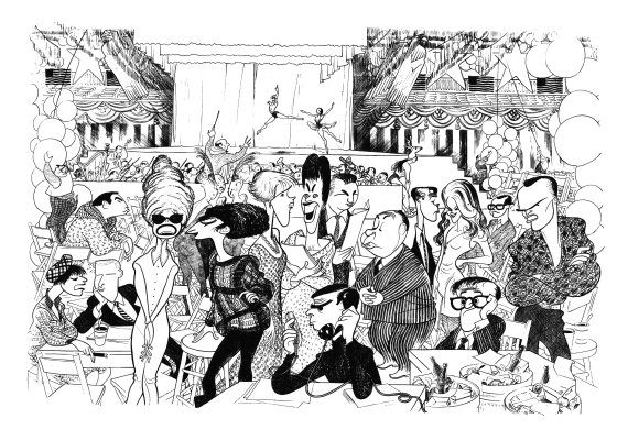 At the instigation of composer Richard Adler who produced Johnson’s Inauguration, Hirschfeld drew a composite of fourteen performers at the festivities. Of course, Ms. Channing was there, as well as Barbra Streisand, Julie Andrews, and Woody Allen, to name a few. Who the man just to the right of the orchestra, running away with a deer head is we don’t know.
