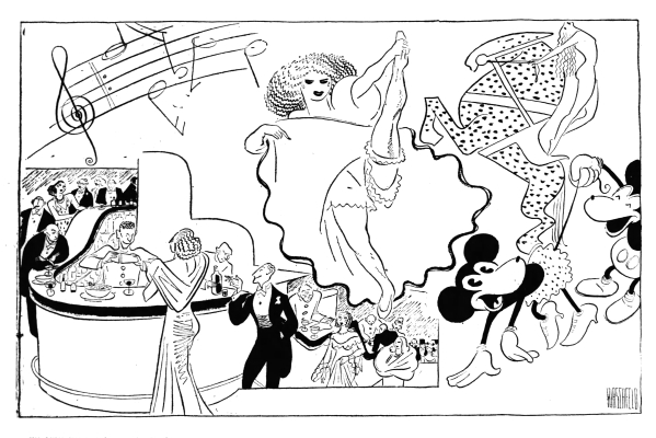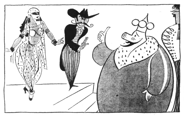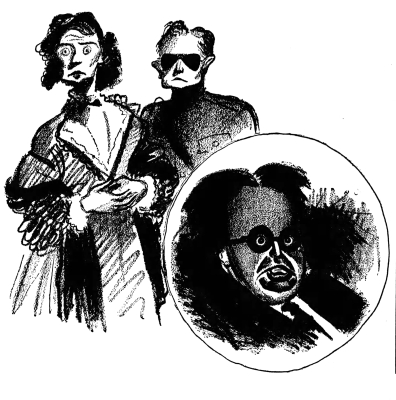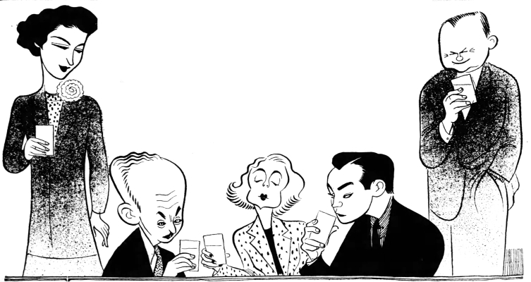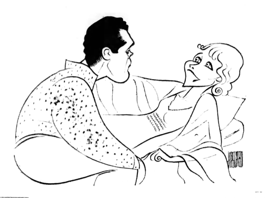 The Eagle featured a number of caricaturists over the years, and Hirschfeld’s first drawing for the paper was of the musical revue, Rain or Shine, starring Joe Cook. It appeared in February 1928, just three weeks after Hirschfeld’s first drawing for the Times. He was an irregular contributor until the Fall of 1934 when his work started to appear two or three times a month. When the paper was purchased in 1936 by new owners, caricature disappeared for nearly a year before returning with a Hirschfeld drawing of a forgotten Arthur Kober comedy, Having Wonderful Time, which was later transformed into a hit musical Wish You Were Here.
