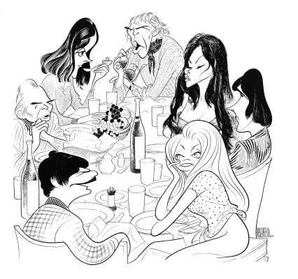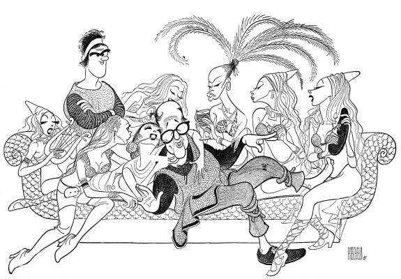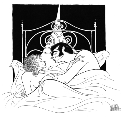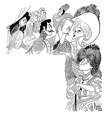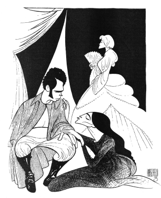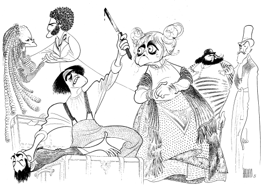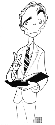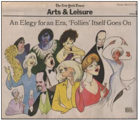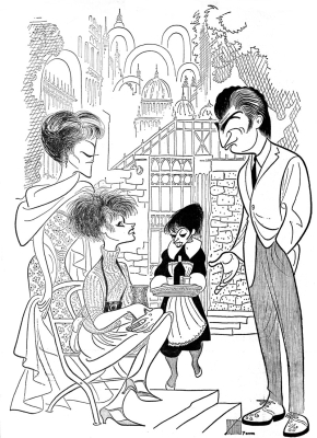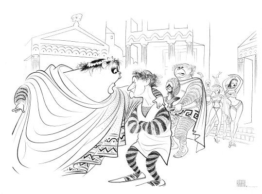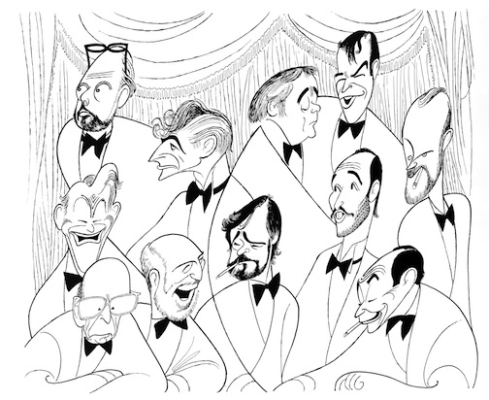 Sondheim refused to sit on his laurels, he was, as the Times called him, “An intellectually rigorous artist who perpetually sought new creative paths.” Hirschfeld captured almost all of Sondheim’s Broadway shows, and few of the films the composer contributed songs or scripts for. Sondheim was also a Hirschfeld collector, acquiring show drawings either directly from the artist or through his friends and collaborators like Hal Prince. In his last interview just five days before his death, the times included a photo of Sondheim with an image of Hirschfeld’s Putting it Together in the background. While the two men were quite different, Hirschfeld would have probably agreed with Sondheim’s quote that “Content Dictates Form; Less is More; God Is in the Details — all in the service of Clarity, without which nothing else matters.”