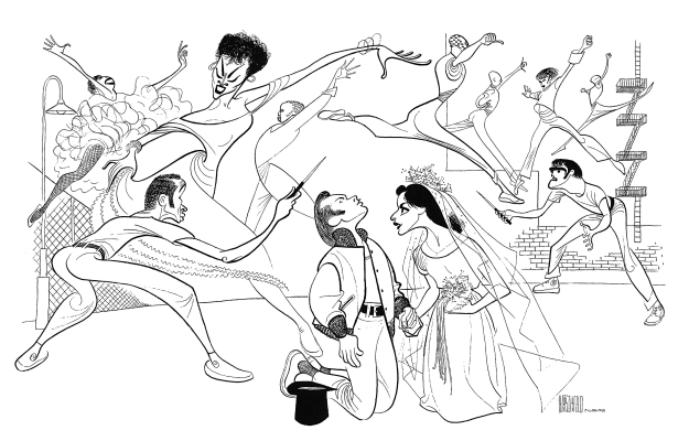 Hirschfeld drew his first Sondheim show in 1957 when Sondheim wrote the lyrics to West Side Story. Hirschfeld had been drawing the American Theatre for more than thirty years at that point. Yet he would go on and record the next half century of Sondheim on Broadway, off-Broadway, and in films. To honor this legend of the American Musical theatre we present this collection of more than 50 images of Hirschfeld drawings of Sondheim and from Sondheim shows.