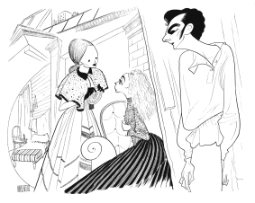 Nina's name, openly but sneakily contrived to be part of the drawing, appeared for the first time. Ever since then I have included her name slyly in all of my drawings. This bit of tomfoolery became one of the worst-kept secrets in the publishing business. The game became a sort of ritual to many readers of the Sunday Times drama page. On one occasion I made the unpardonable error of microscopically lettering in the name of Nina's best girl friend, Lisa, the daughter of the distinguished writer, Louis Kronenberger. Well! all hell broke loose on that one. I received telegrams and flowers from forgotten acquaintances and complete strangers: one all the way from Alaska, congratulating my wife and me on the new arrival.