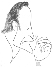 …But pouf, you exclaim, impatient with externals and avid for a clue to his extraordinary graphic talent: whence does Hirschfeld derive his technical skill, his ability to compress into a few slashing lines the quintessence of his subject? As to that, nobody can really say with authority, but there are a couple of possibilities. To begin with, Hirschfeld’s exact age is a matter of speculation. The municipal records in St. Louis give his birth date as January 18, 1963, which is ridiculous; a ten-year-old boy does not have flat feet and a patriarchal white beard, and furthermore, how account for a flop musical comedy he and I collaborated on more than a quarter a century ago? (A question also asked by drama critics at the time.) In seeking to elucidate his facility with the pen, therefore, we must fall back on hypothesis. To mention but one theory, it is a well-known around Broadway that Irving Berlin plays the piano with only one finger and relies on a small colored boy, a brilliant musician, to orchestrate his songs. What is no so well-known is that this pickaninny is also a brilliant caricaturist. Could it be that he furnishes the basic or primary sketches to Hirschfeld, who merely inks them in? I have, in fact, insinuated as much to the latter on occasion, but his sole reaction was a sphinxlike smile…