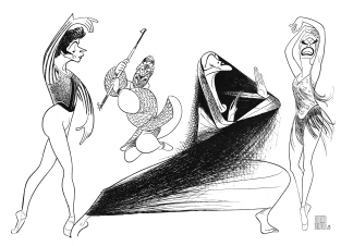 …But pouf, you exclaim, impatient with externals and avid for a clue to his extraordinary graphic talent: whence does Hirschfeld derive his technical skill, his ability to compress into a few slashing lines the quintessence of his subject? As to that, nobody can really say with authority, but there are a couple of possibilities. To begin with, Hirschfeld’s exact age is a matter of speculation. The municipal records in St. Louis give his birth date as January 18, 1963, which is ridiculous; a ten-year-old boy does not have flat feet and a patriarchal white beard, and furthermore, how account for a flop musical comedy he and I collaborated on more than a quarter a century ago? (A question also asked by drama critics at the time.) In seeking to elucidate his facility with the pen, therefore, we must fall back on hypothesis. To mention but one theory, it is a well-known around Broadway that Irving Berlin plays the piano with only one finger and relies on a small colored boy, a brilliant musician, to orchestrate his songs. What is no so well-known is that this pickaninny is also a brilliant caricaturist. Could it be that he furnishes the basic or primary sketches to Hirschfeld, who merely inks them in? I have, in fact, insinuated as much to the latter on occasion, but his sole reaction was a sphinxlike smile…