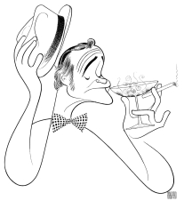 …But pouf, you exclaim, impatient with externals and avid for a clue to his extraordinary graphic talent: whence does Hirschfeld derive his technical skill, his ability to compress into a few slashing lines the quintessence of his subject? As to that, nobody can really say with authority, but there are a couple of possibilities. To begin with, Hirschfeld’s exact age is a matter of speculation. The municipal records in St. Louis give his birth date as January 18, 1963, which is ridiculous; a ten-year-old boy does not have flat feet and a patriarchal white beard, and furthermore, how account for a flop musical comedy he and I collaborated on more than a quarter a century ago? (A question also asked by drama critics at the time.) In seeking to elucidate his facility with the pen, therefore, we must fall back on hypothesis. To mention but one theory, it is a well-known around Broadway that Irving Berlin plays the piano with only one finger and relies on a small colored boy, a brilliant musician, to orchestrate his songs. What is no so well-known is that this pickaninny is also a brilliant caricaturist. Could it be that he furnishes the basic or primary sketches to Hirschfeld, who merely inks them in? I have, in fact, insinuated as much to the latter on occasion, but his sole reaction was a sphinxlike smile…