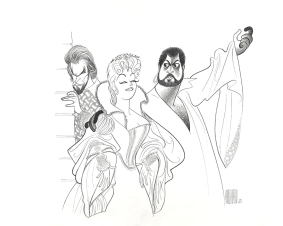 The other, or geriatric, conjecture is one I would normally hesitate to accept, but studies of longevity in Ecuador, Soviet Georgia, and Hunza in northwestern Pakistan tend to support it. Jean Auguste Dominique Ingres, the famed French painter and draftsman, allegedly died in 1867 at the age of 80. I repeat ‘allegedly,’ since as we all know, the Franco-Prussian War was brewing, everybody was running around in circles, and vital statistics often were lost or distorted. Suppose, then, that Ingres didn’t actually die but slipped out of France during the turmoil. Now, where would one go if he was an old Frenchman searching for a secure and peaceful existence? Obivously to some place like St. Louis, a city founded by his countrymen on the Mississippi with extensive levees (Ingres loved levees), and colorful natives strumming banjos, courting and dancing the cakewalk. And just suppose – stay with me a minute — suppose that by sheer happenstance he bumped into the Hirschfeld clan out there, warm-hearted people that took pity on this homeless old foreigner, not knowing his age or the first thing about him, and they adopted him, reared him as one of their own children…You see what I’m driving at? Simply that if Hirschfeld draws like a streak –which he does, yes, yes, enough already — it’s no wonder. So would you if you were Jean Auguste Dominque Ingres and you had 193 years of practice. I don’t know why everybody’s making such a fuss over him. To me he’s just a fat little dwarf with whom I once wrote a flop musical comedy.